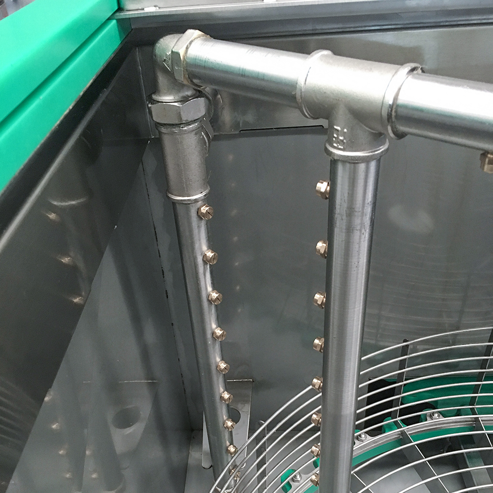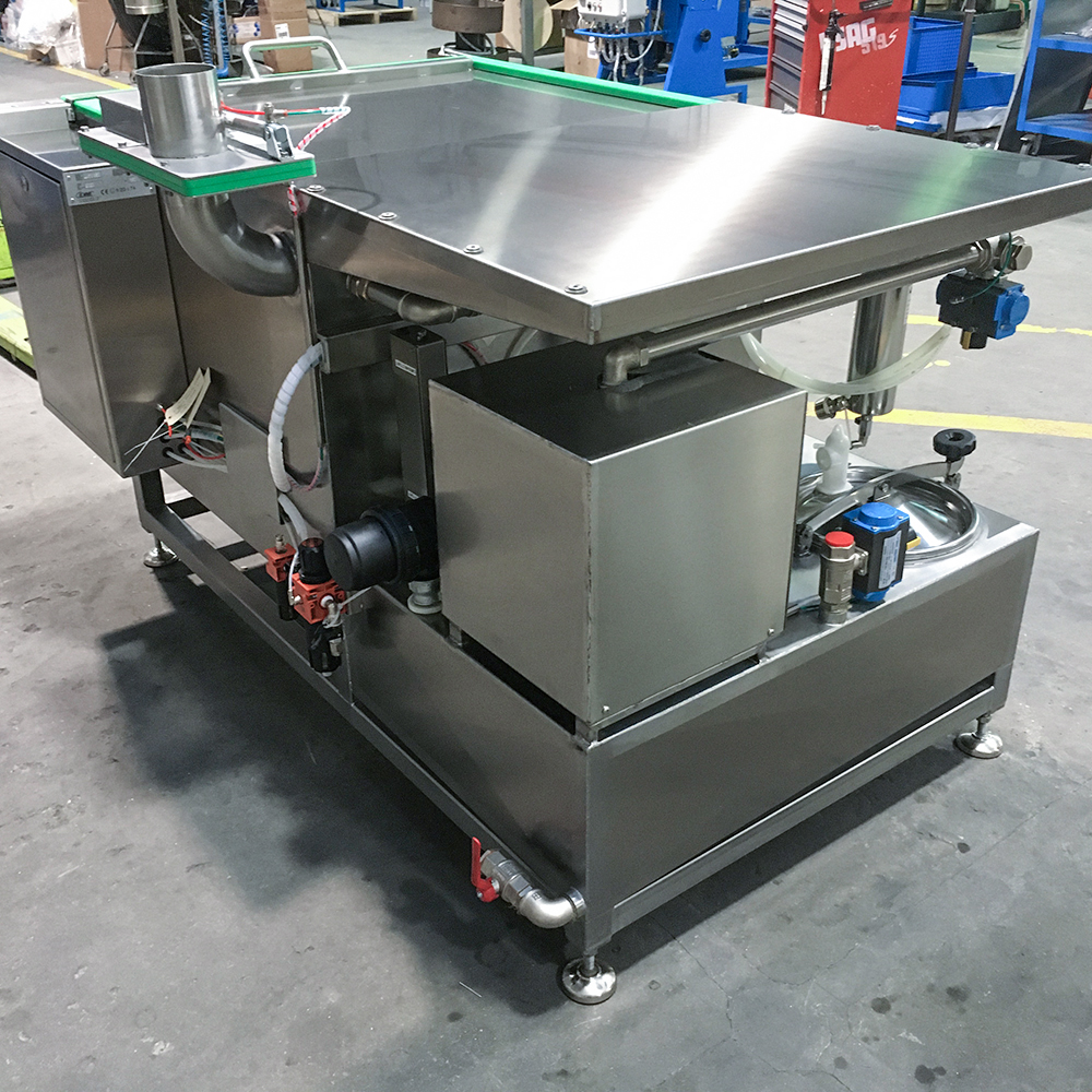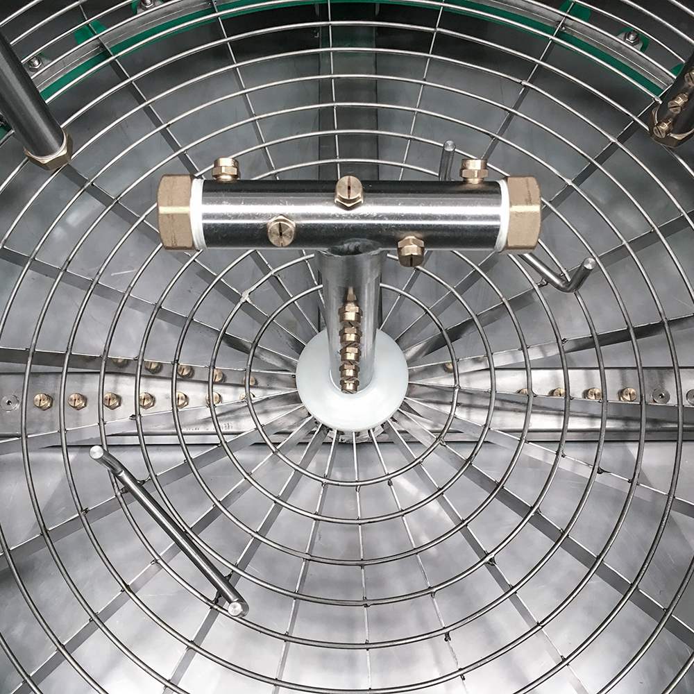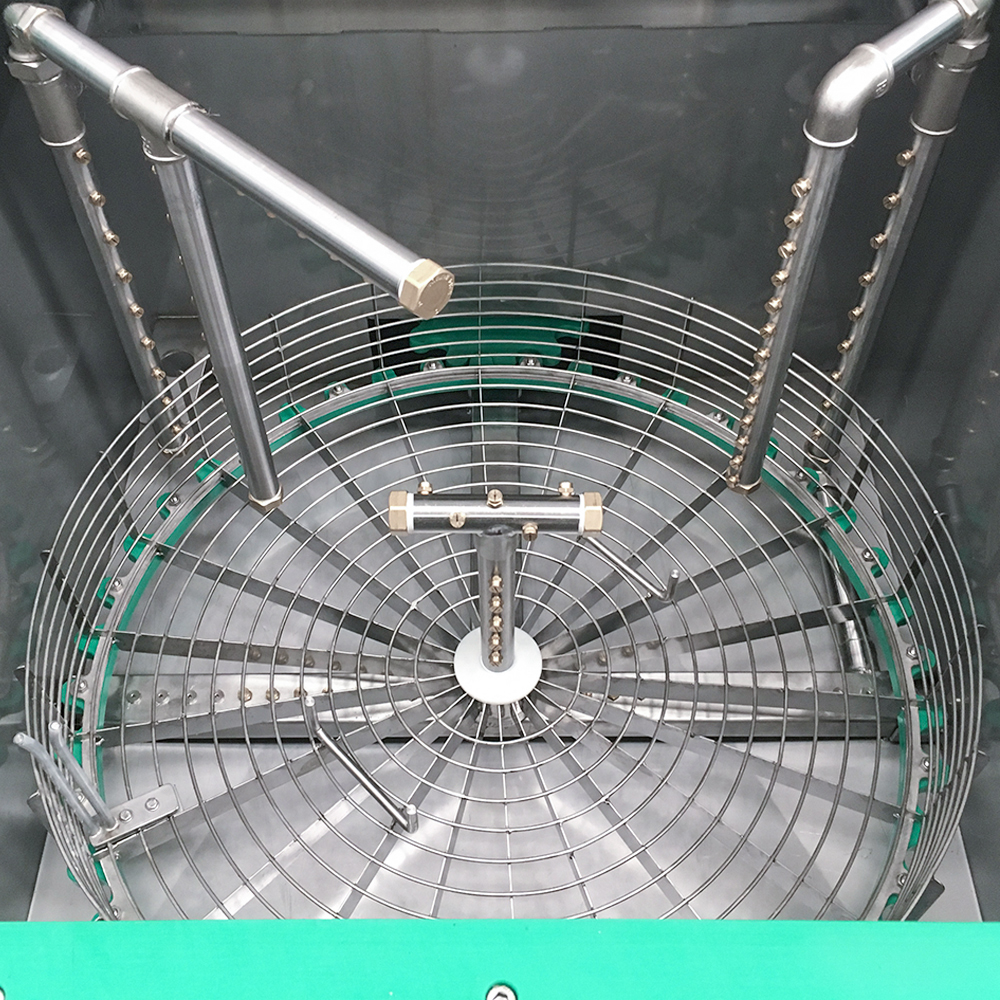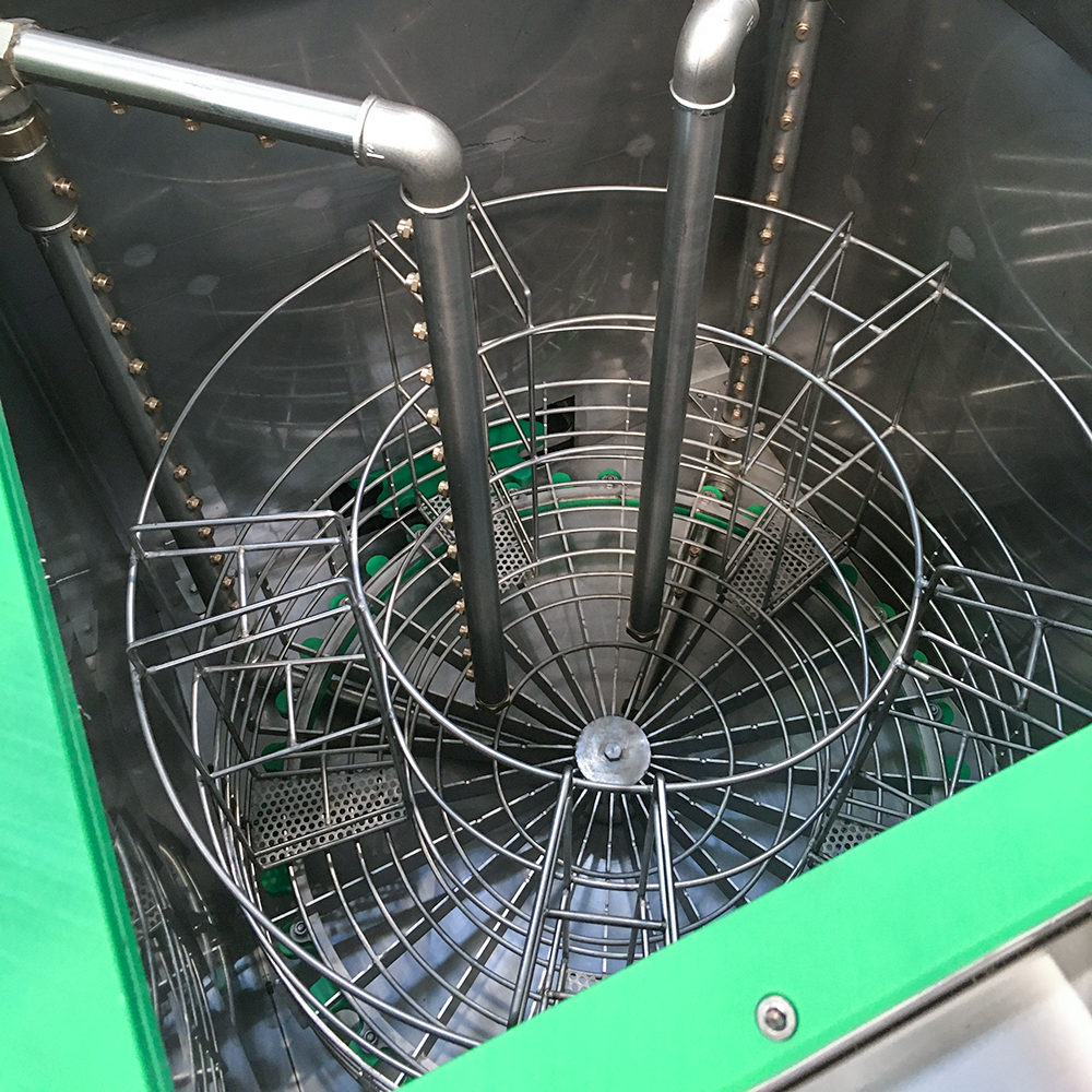 The system uses the rotation of the basket for the cleaning of the parts. The solvent is sprayed through the nozzles on all surfaces and collected in an integrated tank to be recirculated again.